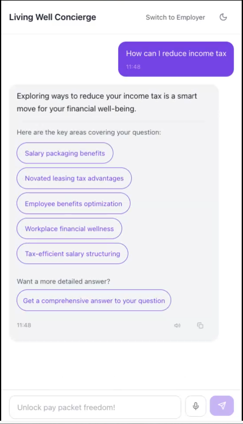The concierge uses a prioritization protocol to find your best financial opportunities. We translate complex tax laws into simple weekly savings, showing you exactly how your net income is impacted. For example, you could save over $30,000 on an EV through a Novated Lease, reduce healthcare costs through telehealth gap fee savings, or compare utility bills. At the end of your experience, you will receive a tailored summary and a personalized action plan.